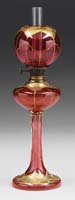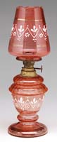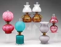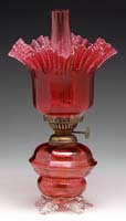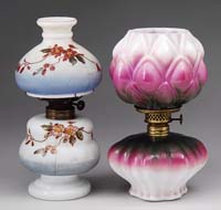 GLASS SHADES AND VASE. Lot consists of two glass shades, the first being a milk glass ball shade for a kerosene lamp. This shade is decorated with transfer pattern roses and is shaded from white milk glass in the middle to pink at top and bottom. The second shade is green glass shading from light green to very dark green at the point. The shade is pressed in the form of a bowl filled with fruit. The lot is concluded with a hand-blown vase in ruby red glass with diamond quilted pattern. SIZE: Fruit shade 12″ h. Ball shade 6″ h. Vase 7″ h. CONDITION: The lot is very good with the exception of a small chip to fitter of ball shade. 13-9330 13-9331, 13-9332 (30-100)