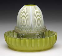 STEUBEN GREEN OPTIC WAVE SHADE. Outstanding Steuben shade has green optic wave decoration against a pearl white background. The body of the shade is nicely ribbed and is finished with a lightly flaring ruffled rim. The interior of the shade has a rich gold iridescence with green and purple highlights. Shade is signed on inside of fitter with silver fleur de lis. SIZE: 4-1/4″ h. x 5-1/2″ dia. CONDITION: Very good to excellent. 5-67984 (750-1,100)
