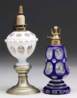 THREE PIECES OF OPALINE GLASS. Three pieces of Italian opaline glass, 1) Blue opaline covered powder jar with original metal base and rim and retains original paper label. 2) Blue opaline covered jar with original metal base and rim and retains original paper label. 3) Pink opaline bottle with original metal base and rim. SIZE: 4″ t to 7-1/4″ t. CONDITION: Very good to excellent. 13-9320 (100-150)