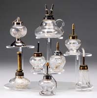 EIGHT DECORATED ART GLASS SHADES. Attributed to Steuben, these shades of typical bell form are decorated with a white pulled feather decoration with green on a gold aurene-type ground. Unsigned. SIZE: 5″ t x 2-1/4″ fitter. CONDITION: Very good with most having minor rim chips to fitters. 5-67671 (1,200-1,800)