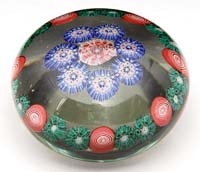PAPERWEIGHT TECHNIQUE ART GLASS VASE. Green glass vase shading to blue with random bubbles and a decoration of pink, purple and blue flowers having green leaves. Signed on underside of vase “Oninotyth”. SIZE: 6″ t. CONDITION: Very good to excellent. 5-67495 (200-300)
