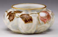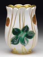CONSOLIDATED ART GLASS VASE. Milk glass with painted berries and green leaves in a blown-out mold design. SIZE: 9-1/2″ t. CONDITION: Very good to excellent. 5-67307 (100-200)
