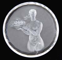 PLASTER PLAQUES AND GLASS CRUET. Lot consists of three plaster forms of a lady’s face, a plaster plaque of the Madonna, and a glass cruet. The lady’s faces are plaster castings with various painted finishes, one casting is impressed on the edge “Ulrich”. The Madonna plaque shows the Madonna with crossed arms, with white glaze, and painted blue background. Plcque impressed on the back “Anton Lang”. The cruet is hand-blown glass in aqua color with textured finish, applied matching handle, and original stopper. SIZE: Each face 11″ l. Madonna 8-3/4″ x 10-3/4″. Cruet 7″ h. overall. CONDITION: Plaster faces have some minor repairs, some wear to color, and one is missing a portion of the neck. The Madonna is very good with some crazing to the white glaze. The cruet is very good. 13-9317 13-9327, 13-9328 (75-125)