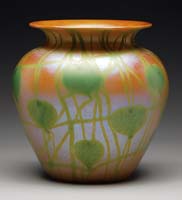 ART GLASS VASE. Interesting art glass vase has purple iridescent lily pad decoration against a green and gold iridescent background. Vase rests on a three legged holder with curving handle decorated with a resting butterfly. Vase is attached to the holder with a small threaded bolt. Vase is signed with a spurious Tiffany signature, it is not Tiffany. SIZE: 8-1/4″ h. CONDITION: Very good to excellent. 13-9348 (100-200)