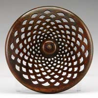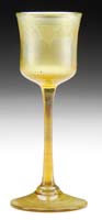 STEUBEN DECORATED ART GLASS SHADE. Beautiful oversized trumpet shaped shade has gold hooked feather design on a calcite ground. Signed on fitter with fleur de lis mark. SIZE: 6-1/2″ t. CONDITION: Very good to excellent. 5-66326 (300-500)