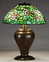 TIFFANY ART GLASS SHADE. Early bell formed shade begins with matte white background and is decorated with gold iridescent chain design. Signed on fitter “L.C.T.”. SIZE: 5″ t x 4″ across x 2-1/4″ fitter. CONDITION: Very good to excellent with minor fleabites to bottom rim as well as tool marks throughout. 5-66342 (300-500)