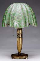 PAIR STEUBEN SHADES. Pair of Steuben shades, each having green pulled loop design descending from the fitter and outlined in gold iridescence against a cream-colored background. The shades flare out to a ruffled rim and are finished with bright gold iridescence on the interior. Each shade is marked with the Steuben silver fleur de lis mark. SIZE: Each 4-3/4″ h. x 6-1/4″ dia. CONDITION: Some minor fitter chips and one shade has old hairline crack. 5-67763 (500-700)
