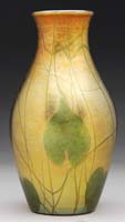 ROOKWOOD DECORATED VASE. Very pretty Rookwood vase has yellow floral and vine decoration descending from the lip against a nice shaded yellow background. The Rookwood mark is lightly stamped but appears to date the vase 1886. Base is signed with artist’s initials, again difficult to decipher but appear to be those of Laura A. Fry. SIZE: 6″ h. CONDITION: Very good to excellent, with minor crazing. 5-67934 (150-250)