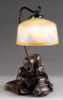 PAIR LUSTRE ART SHADES. Extremely nice Lustre Art shades, each having gold iridescent pulled feather design descending from the fitter. The pulled feathers are outlined in green and set against a creamy pearlescent background. The rim of each shade is finished with a tiny band of gold iridescence. The interior of each shade has very bright gold iridescence with red highlights. Each signed on inside of fitter “Lustre Art”. SIZE: Each 6″ h. CONDITION: Very good to excellent with some minor roughness to fitters. 5-67765 (400-600)