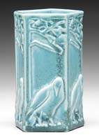 ROOKWOOD BUTTERFLY VASE. Lovely Rookwood vase is decorated with raised butterflies surrounding the vase. Vase is finished in a beautiful bright blue glaze and dated 1948 and numbered 6509 with an “X” scratched in the glaze on the bottom. SIZE: 4-1/4″ h. CONDITION: Very good to excellent. 5-67939 (200-400)