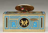 ROOKWOOD FIGURAL DISH. Nice Rookwood dish is in the shape of a lyre with faun resting on the side of the lyre playing a flute. Marked on the back with Rookwood flame mark and dated 1927. The back is also impressed “N.F.W. 1927 M.C.”. SIZE: 3-7/8″ x 5-1/4″. CONDITION: Very good to excellent. 5-67948 (100-300)