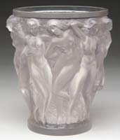 TWO CAMEO & FROSTED ITEMS. 1) Whiskey taster with a cameo decoration of an amber rooster on a frosted and chipped ice background. 2) Clear glass rose bowl with an enamel gold cameo decoration of mythological figures on a textured and frosted background. SIZE: Whiskey is 3″ t. Rose bowl is 5-1/2″ dia. CONDITION: Whiskey taster has a chip to the rim as well as the base. The rose bowl is very good to excellent. 5-63299 5-63300 (50-75)