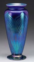CONTEMPORARY ART GLASS VASE. Very nice art glass vase has green iridescent pulled feather design against a rich blue, slightly iridescent background. Interior of the mouth is finished with a nice platinum iridescence. SIZE: 11″ h. CONDITION: Very good to excellent. 13-9352 (100-200)