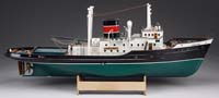 HUBLEY FRIENDSHIP SEAPLANE. A true classic and a highly sought after toy airplane. A typical seaplane of the 1930s, this tri-motor is enameled in a vibrant yellow with blue trim. When the child would pull the cord and drag the toy behind him, the three nickel plated propellers would turn in unison and the child would imagine the plane taking off into the wild blue yonder. Original pull cord is intact and never unraveled, this toy would benefit greatly from a light cleaning to remove 70 years of dust and dirt accumulation. SIZE: 13″ wingspan. PROVENANCE: From the collection of the late Larry Seiber of San Jose, CA. CONDITION: Very fine plus with a tight hairline crack to fuselage (in front of pilot). 1-9111 (1,500-2,500)