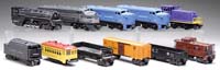 LIONEL POST WAR O GAUGE DIESELS AND PARTIAL ELECTRONIC SETS. Lot consists of scarce #626 B&O center cab in near excellent condition, a pair of #205 Missouri Pacific Alco diesels in excellent condition, a #2354 New York Central dummy unit in good to very good condition, a #60 trolley in near excellent condition, and a #671 electronic set with locomotive, tender, 4357 caboose (missing top of smokestack), 4454 Baby Ruth boxcar (missing some parts), gondola (complete and all original), and a 5459 coal dump (missing one side). Overall electronic set is good to very good. CONDITION: As noted above. 1-9011-3, 1-9015-1 (700-1,000)