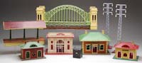 LIONEL STANDARD GAUGE AND “O” GAUGE LOT OF SIXTEEN ACCESSORIES. Includes a #300 Hellgate bridge in early colors, a #92 floodlight tower, in late colors, three MTH high tension towers, a 122 station, a 115 station, a 155 station platform in early colors, two #126 stations, two standard gauge bridges in light green, two “O” gauge three-piece bridges, one LCL container, one standard gauge three-piece bridge, and a 440 signal bridge. CONDITION: Overall lot grades good to very good. 1-9014 (800-1,200)