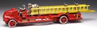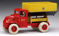ARCADE SCISSOR DUMP MACK COAL TRUCK. A classic Mack truck in vibrant red paint, still retaining shovel and divider in rear bed. “Coal” is stenciled on either side with dual spoked nickel-plated rear wheels. Brilliantly painted in red with gold highlights, this toy retains its original Arcade sticker. SIZE: 10″ l. PROVENANCE: From the collection of the late Larry Seiber of San Jose, CA. CONDITION: Very fine plus to near mint. 1-9116 (1,500-2,500)
