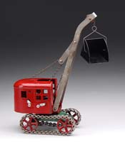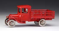 ARCADE INTERNATIONAL RED BABY DUMP TRUCK. Perhaps one of the finest known examples to exist. With rubber tires covering disc hubs, this toy looks like it just came from the factory (even though it was 70 years ago). Although somewhat common, this is undoubtedly an upgrade for just about any collector! It must be seen in person to fully appreciate the condition of this toy. SIZE: 10-1/2″ l. PROVENANCE: From the collection of the late Larry Seiber of San Jose, CA. CONDITION: Near mint, this toy is a screamer. 1-9076 (800-1,200)