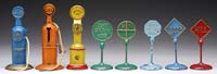 LOT OF 8 ARCADE ROAD SIGNS & GAS PUMPS. A nice grouping of multicolored Arcade fixtures. The five road signs have Arcade labels intact. Two of the three gas pumps have Arcade decals. SIZE: Ranges from 4″ to 6″ PROVENANCE: From the collection of the late Larry Seiber of San Jose, CA. CONDITION: Overall very good. 1-9136 (600-800)