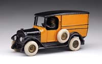 ARCADE “YELLOW CAB” PANEL TRUCK. Panel trucks, being highly desirable, this particular example is painted in orange and black was dubbed the “Yellow Cab” delivery truck. This delivery truck features rubber tires with iron hubs and includes a side mount by driver’s side door and an electroplated driver. Seldom found, and usually not in stellar condition as this one is. SIZE: 8-1/4″ l. PROVENANCE: From the collection of the late Larry Seiber of San Jose, CA. CONDITION: Overall very fine to near mint. 1-9140 (2,500-3,500)