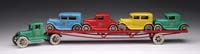 24″ ARCADE CAR CARRIER WITH 4 CARS. The largest of any car carrier made by any toy company. The truck cab pulls an extended tin bed containing four automobiles. Three of the four cars retain original Arcade decals as does truck cab and flat bed. All units have nickel plated cast iron spoked wheels. SIZE: 24″ l. PROVENANCE: From the collection of the late Larry Seiber of San Jose, CA. CONDITION: Overall very fine plus. 1-9144 (1,500-2,500)