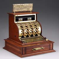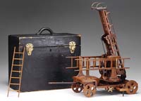 KENTON OVERLAND CIRCUS CALLIOPE TRUCK. Mimicking real life, this truck would drive down the street announcing the forthcoming circus. The Kenton toy company replicated this vehicle in toy form and of course every young man would associate the good times at the circus with this toy. Uncommon, this version is the large size and comes in the unusual bright orange with gilt trimming and imitation white balloon tires made of cast iron. SIZE: 9″ l. PROVENANCE: From the collection of the late Larry Seiber of San Jose, CA. CONDITION: Overall good to very good, missing one figure, and driver is incorrect. 1-9085 (800-1,200)