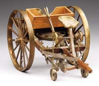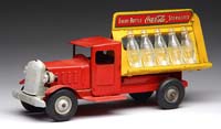 RARE BOTTLE SHAPED BORDEN’S MILK WAGON. Once again, toys imitate real life. This vehicle was shaped like a milk bottle, just like the real vehicle that traveled about the country in the late 1930s-1940s. Comical, absurd, questionable are just a few of the words that come to mind when one saw this vehicle coming down the highway. A unique toy and a pleasant reminder of times gone by. Enameled in robin’s egg blue with gold trim and solid rubber tires. SIZE: 6″ l. PROVENANCE: From the collection of the late Larry Seiber of San Jose, CA. CONDITION: Very fine. 1-9143 (800-1,200)