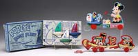 LITHOGRAPHED TIN MOXIE HORSEMOBILE & 6 PACK MOXIE SODA. A promotional giveaway by the Moxie company, this toy was shipped to the child in a flat envelope. Upon receipt the child (or his father) folded the “axles” away from the car, enabling the vehicle to stand up. This particular version is a bit more unusual than the common red version. Included with this toy is an original vintage cardboard 6-pack with unopened bottles of Moxie soda, Maine’s favorite beverage. SIZE: 8-1/4″ l. PROVENANCE: From the collection of the late Larry Seiber of San Jose, CA. CONDITION: Toy is near mint, soda is excellent. 1-9137 (800-1,200)