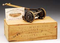 CLOCKWORK “SAY IT WITH FLOWERS” MOTORCYCLE. The crown jewel of any cast iron motorcycle or automotive toy collection. A fabulous toy by itself, but then add the clockwork mechanism to further enhance the appeal and rarity of this toy. Only a handful of cast iron toys were ever produced with clockwork mechanisms. Believed to be one of only 2 or 3 known existing clockwork examples, this toy is in remarkable, untouched, uncleaned, as found condition. A very light soiling to enameled blue could be easily cleaned to bring the toy back to its vibrant original luster and beauty. The motorcycle is enameled in robin’s egg blue with gilt trims and a lacquered black roof. Black rubber tires (some distressing), polished aluminum handlebars and a nickel plated engine head increase the desirability of this toy. Decals depicting the Indian logo on fuel tank and flowered decals adorning body of delivery van. Just another example of Larry’s quest for the best in automotive toys! SIZE: 10″ l. PROVENANCE: From the collection of the late Larry Seiber of San Jose, CA. CONDITION: Overall very fine plus, clockwork mechanism untested. 1-9135 (50,000-75,000)