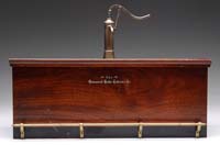 LARGE ARCADE MACK ICE TRUCK. An absolutely incredible all-original example right down to the removable tailgate, a plethora of simulated ice cubes, tongs, and tool chest located behind driver. The Arcade toy company replicated the Mack truck in the finest detailing possible, making a variety of different vehicles such as this unit. Robin’s egg blue with gilt highlights, and nickel plated driver. SIZE: 10-1/2″ l PROVENANCE: From the collection of the late Larry Seiber of San Jose, CA. CONDITION: Very fine plus to near mint. 1-9119 (2,000-3,000)