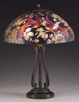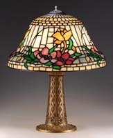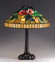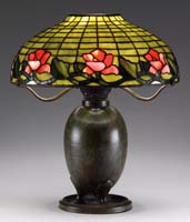 GORHAM ROSE LEADED TABLE LAMP. Roses are shown in various stages of bloom from buds to full bloom. Colors used in this rose pattern range from soft pink to rose to deep purple. Foliage is represented in deep green hues, while the mixed geometric background of green runs the gamut. The glass used in this shade is heavily textured, so when lit it simply sparkles. Shade is supported by a three socket, nicely patinated base of high art nouveau styling. It is completed with three sockets, pulls and top cap. SIZE: Shade is 18″ dia. Lamp is 23″ t. CONDITION: Overall very good to excellent with very few tight hairlines in the shade. 5-69277 (7,000-10,000)