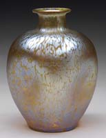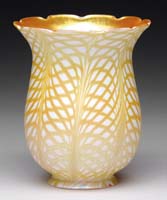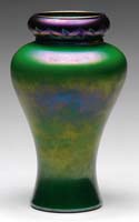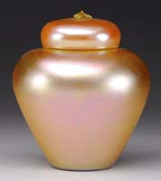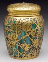 TIFFANY STUDIOS GRAPEVINE HUMIDOR. Scarcely found grapevine humidor is decorated with a gold grapevine pattern on jar and exterior lid with the inner cap having a gold pine needle decoration. The jar section of the vase is backed with deep green striated glass. A similar example may be found in the book Tiffany Desk Sets by William R. Holland on page 89 in Fig. 3-26. Even though the interior cap is pine needle, we feel that this humidor has always been this way and it is fairly common to find Tiffany desk items in mixed etched metal patterns. This humidor could quite possibly have been a special order with the gold finish and green glass. The jar is signed “Tiffany Studios New York”. SIZE: 6-1/2″ t. CONDITION: Very good to excellent with minor wear to gold finish. 5-68966 (4,000-6,000)