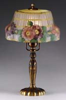 JEFFERSON SCENIC TABLE LAMP. This beautifully reverse painted scene depicts white birch trees along side a lake with a summer scene all around. In colors of blue, yellow, and green this shade represents summer at its peak. The shade is supported by an original two socket Jefferson base with complimentary antique brass finish. The shade is signed “2682 Jefferson Co.” and is artist initialed. SIZE: Shade 18″ diameter. Lamp 23″ t. CONDITION: Very good to excellent with minor wear to base. 5-69781 (1,500-2,000)