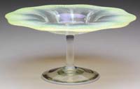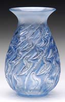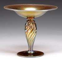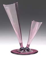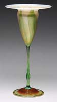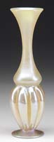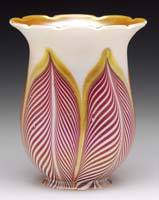 SILVERIA ART GLASS VASE. Rare vase attributed to Stevens & Williams at the turn of the century, this vase begins with a large fluted top and then twists down to its foot in colors of mauve, silver and blue all on a silver ground. It is also further decorated with green applied glass threading. SIZE: 6″ t x 8-1/2″ dia. CONDITION: Very good to excellent with several areas of oxidized open bubbles to rim and sides of vase. 5-69293 (8,000-10,000)