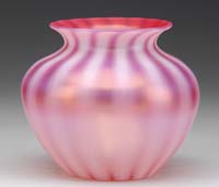 PINK SATIN GLASS VASE. Pretty pink satin vase has zigzag pattern encircling the bulbous ribbed body which gives way to a tall, slightly flaring neck. Vase is finished with white cased interior. SIZE: 7″ t. PROVENANCE: From the Estate of Geraldine Gaba, Scottsdale, AZ. CONDITION: Very good with some staining to pattern at the lip and tiny fleabite to interior lip. 5-68301 (300-500)