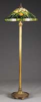 BRADLEY & HUBBARD LEADED LAMP. Attributed to Bradley & Hubbard this leaded lamp begins with a beautiful mauve floral decoration over a green geometric brick background. Connecting the floral decoration is a darker green glass with blue striations. The shade is supported by a three armed base of bulbous form resting atop three feet and a circular platform. SIZE: Shade 14″ diameter. Lamp 16″ t. CONDITION: Very good to excellent with a few cracked panels and some minor solder repairs. 5-69185 (1,500-2,000)
