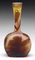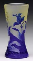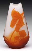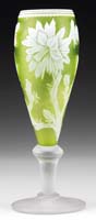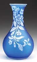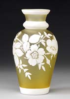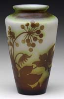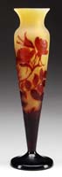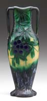 MT. WASHINGTON DECORATED BURMESE VASE. Matte finish Burmese glass shading from pink to soft yellow with an enameled decoration of stylized flowers, leaves, berries and stems. Unsigned. SIZE: 11-1/2″ t. CONDITION: Very good to excellent. 5-68807 (1,500-2,500)