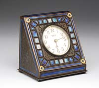 TIFFANY STUDIOS ACANTHUS CENTER MOUNT CLOCK. This rare and unusual clock begins with a gold dore finish and is decorated with acanthus leaf decoration, top knob and is finished with scrolls on either side. This clock would compliment any gold dore desk set or could be used as a mantle clock. Face of clock is signed “Tiffany & Co. New York” and the reverse is signed “Tiffany Studios New York 2073” and works, which appear to be original are signed “Chelsea Clock Co. Boston, USA” and “182284”. Key is present with clock. SIZE: 11″ x 7-1/2″ t. CONDITION: Very good to excellent with wear commensurate with age. 5-69480 (2,000-3,000)