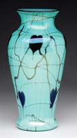 DOULTON LAMBETH VASE. Doulton Lambeth vase has center belt decorated with incised and painted sheep in a meadow. Belt is bordered at top and bottom by a beautiful stylized leaf pattern in shades of blue and purple against an earthen brown background. Neck of the vase is impressed with stylized floral designs and the lip is finished with a rich cobalt blue glaze. Impressed on the underside “Doulton Lambeth 1880″ and artist initials. SIZE: 13-3/4” t. CONDITION: Very good to excellent. 5-69482 (800-1,200)