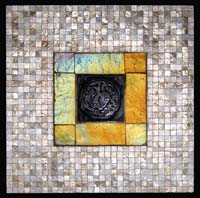 HIGH QUALITY ART GLASS LAMP. Handsome leaded shade, attributed to Gorham is constructed in a multitude of hues ranging from amethyst, to rose, to golden yellow, and to lemon yellow. Each panel is comprised of striated glass with each of the colors mentioned. Further accenting the shade is a band of bent panel glass in various shapes but of the same color scheme as the geometric panels. The outside of this shade is elaborately decorated in bronze work with grapes, and art nouveau foliage. Further accenting this lower bronze work are medallion faces of Bacchus in high relief. Adorning his head are grapes and leaves. Extending upwards from this bronze apron is a vertical draped ladder design that ends with a bent panel crown and more ornate bronze work. The shade is supported by an equally impressive base of high art nouveau styling that carries this influence even further. This is absolutely one of the finest leaded lamps we have had the opportunity to offer. SIZE: Shade 20″ diameter. Lamp 29″ t. CONDITION: Very good to excellent. 5-69203 (8,500-10,000)