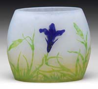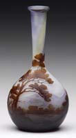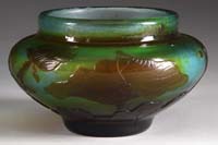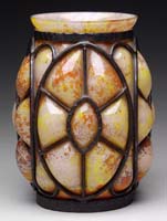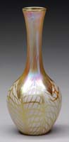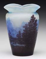 LITHYALIN VASE. Wonderful early art glass vase of lithyalin glass has enamel decoration of a pine bough and two pine cones. The lithyalin glass has nice agate marbling in tones of brown, tan and green with some blue highlights. Vase is finished with a light gilding on the six sided lip. SIZE: 3-3/8″ t. CONDITION: Very good to excellent with some minor wear to gilding. 5-68811 (500-1,000)