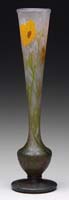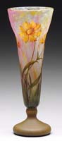 MT. WASHINGTON PEACH BLOW DECORATED VASE. Pink shading to a pale blue glass with an enameled decoration of yellow daisies, green leaves, brown branches and traceries. SIZE: 7-3/4″ t. CONDITION: Very good to excellent. 5-69147 (2,000-3,000)