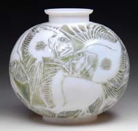 MOSER ENAMELED VASE. Wonderful Moser vase has smoky colored glass with two applied handles running from the bulbous body to the tall slender neck. Body of vase is enameled with an aquatic scene of fish, lily pads and vegetation. Unsigned. SIZE: 7-1/2″ t. CONDITION: Very good to excellent. 5-68934 (200-400)