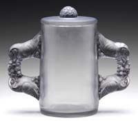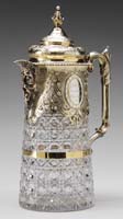 CUT GLASS & STERLING TANKARD. Exceptional cut glass tankard has cylindrical body cut in a cane pattern and mounted with sterling silver collar, handle, spout and lid. A center oval cartouche is engraved “William Shaw From His Friend J.F. Ehrenbaeher 1883”. The figural spout depicts Old Northwind and the collar and lid are decorated with chased and repose design. Silver lid is hallmarked “OB” within an oval, a standing lion within a shield and an “H” within a shield. SIZE: 12″ t. CONDITION: Very good to excellent. 5-69457 (700-1,000)