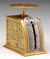 TIFFANY STUDIOS GRAPEVINE SCALE. Gold Grapevine pattern is backed by caramel glass. Crescent dial is very good with a patent date of June 2, 1896. Signed “Tiffany Studios New York 872”. SIZE: 3″ t. CONDITION: Very good to excellent. 5-69430 (1,200-1,500)