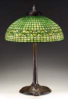 TIFFANY STUDIOS BRONZE SHADE FRAME. Ornate shade frame carries a desirable green-brown patina finish and is of Moorish design. Beginning at the top it has two rope bands on either side of beading, a large open work design would then cover the majority of a glass shade with the border having ornate scroll work. SIZE: 15″ dia., 7″ t. CONDITION: Very good to excellent. 5-68879 (300-500)