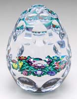 ANTIQUE CLICHY PAPERWEIGHT. Open millefiori concentric design in colors of amethyst, white, pink and blue on a clear ground. There are six side facets and one top facet. SIZE: 2″ dia. CONDITION: There is minor roughness on the edges of the facets, otherwise very good. 5-69753 (300-500)