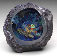 MT. WASHINGTON LAVA GLASS LAMP BASE. Black lava glass with colored glass shards of blue, green and pink. Original metal base and frosted glass font. Burner is signed “No 2 Queen Anne”. SIZE: 15″ t. CONDITION: Very good to excellent. 5-68670 (3,000-4,000)