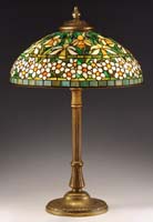 MORGAN ANTIQUE LEADED TABLE LAMP. Attributed to John Morgan & Sons, this lamp begins with a fully leaded shade depicting black eyed susans constructed in hues of oranges and yellows with a multitude of green representing the foliage and the background glass finished in a very pretty soft teal hue. Shade, which has an irregular border is supported by an original two socket base complete with two acorn pulls and has a desirable green/brown patina finish. Shade and base may be further referenced in the book Mosaic Shades Volume II by Paul Crist, pgs 104 and 113. SIZE: Shade is 18″ dia x 9″ d. Lamp is 26″ t. CONDITION: Overall very good to excellent with minor cracks to glass in shade. 5-69810 (12,000-15,000)
