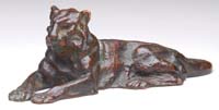 TIFFANY STUDIOS LIONESS PAPERWEIGHT. Bronze paperweight carries a dark brown patina finish with green highlights and depicts a lioness in repose. This example is extremely well detailed. Signed “Tiffany Studios New York 932”. SIZE: 5″ l. CONDITION: Very good to excellent. 5-69797 (700-1,000)